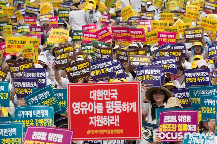 (서울=포커스뉴스) 23일 오후 서울 중구 시청광장에서 보육관계자들이 '어린이집 0~2세 맞춤형 보육제도 개선 및 시행 연기'를 촉구하며 결의대회를 하고 있다.