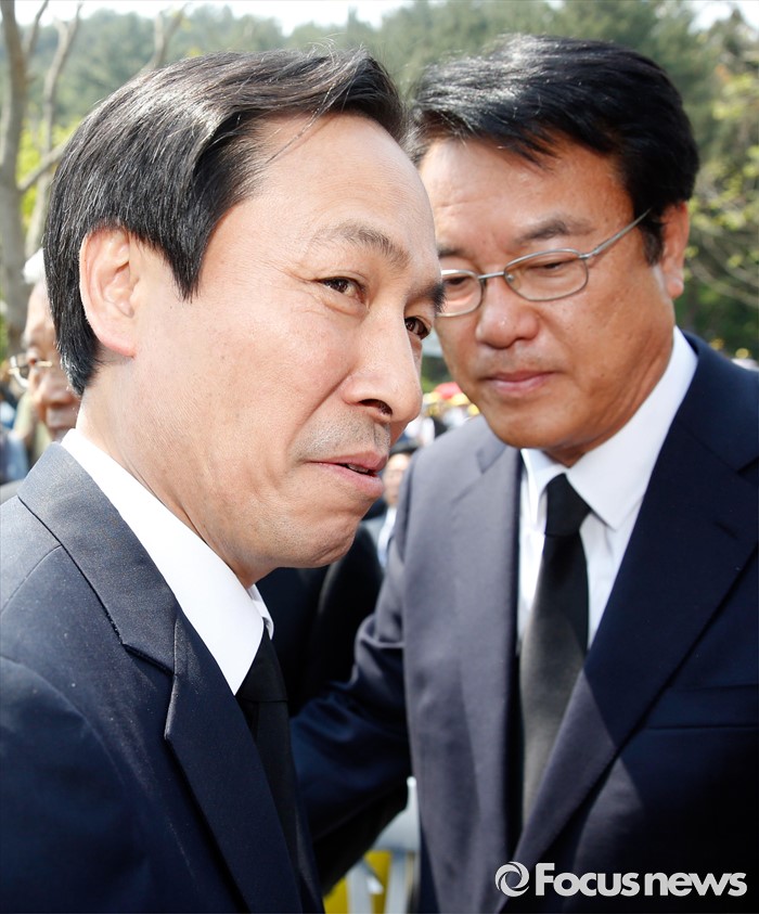 (김해=포커스뉴스) 23일 오후 경남 김해 봉하마을에서 엄수된 故 노무현 전 대통령 서거 7주기 추도식에 참석한 정진석(오른쪽) 새누리당 원내대표와 우상호 더불어민주당 원내대표가 인사하고 있다.