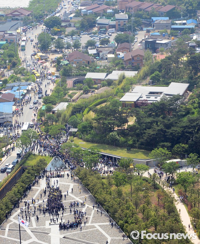 (김해=포커스뉴스) 23일 오후 경남 김해 봉하마을에서 엄수된 故 노무현 전 대통령 서거 7주기 추도식을 마친 뒤 참배객들이 헌화를 하고 있다.