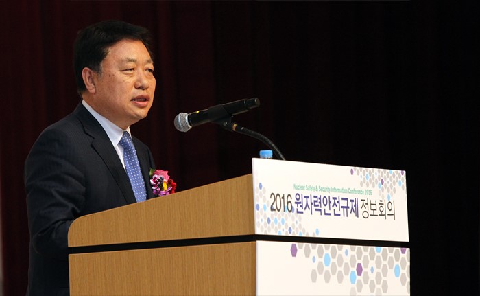 (대전=포커스뉴스) 김용환 원자력안전위원회 위원장이 23일 대전 컨벤션센터에서 열린 2016원자력안전규제정보회의에 참석해 축사를 하고 있다. <사진제공=원자력안전위원회>