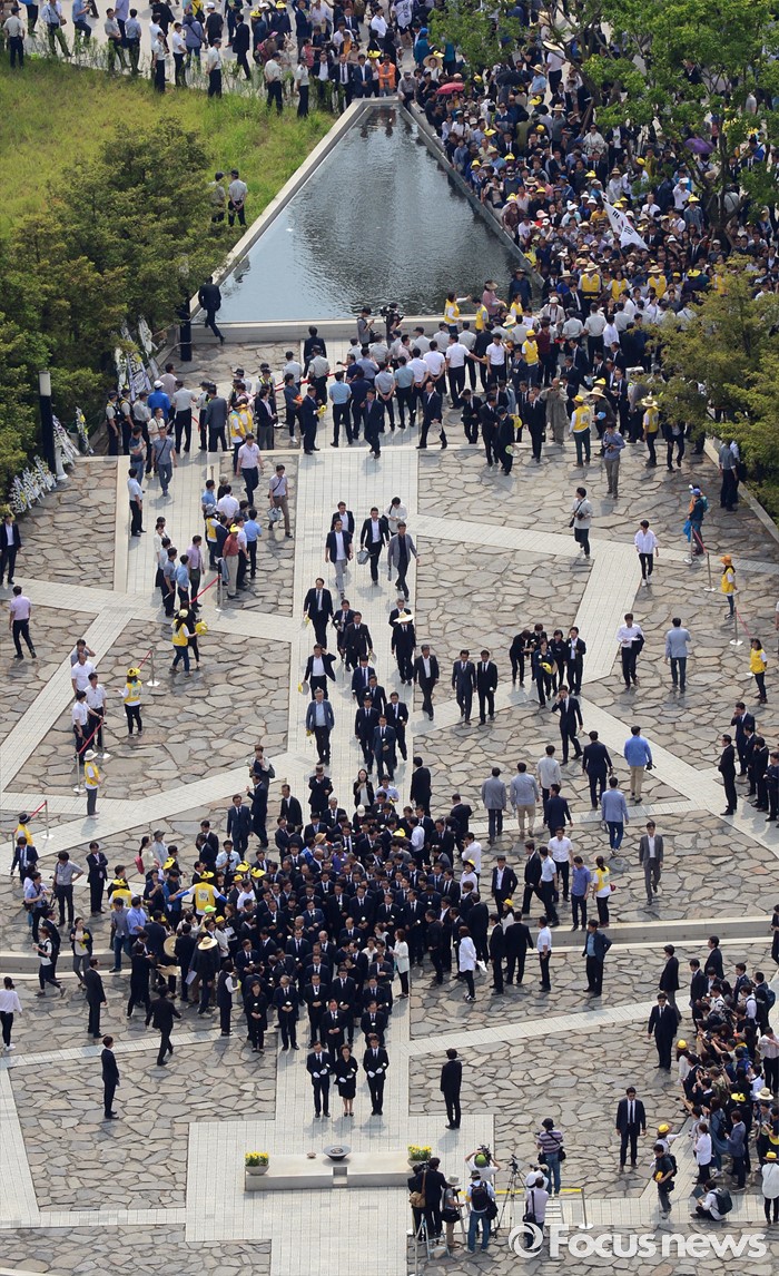 (김해=포커스뉴스) 23일 오후 경남 김해 봉하마을에서 엄수된 故 노무현 전 대통령 서거 7주기 추도식을 마친 뒤 노 전 대통령 부인 권양숙 여사를 비롯한 참배객들이 헌화를 하고 있다.