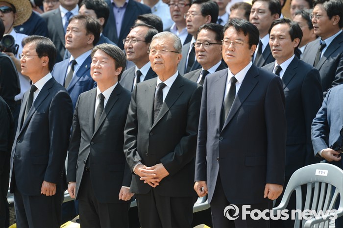 (김해=포커스뉴스) 23일 오후 경남 김해 봉하마을에서 엄수된 故 노무현 전 대통령 서거 7주기 추도식에 참석한 정진석(앞줄 오른쪽부터) 새누리당 원내대표, 김종인 더불어민주당 비대위 대표, 안철수 국민의당 상임공동대표, 천정배 공동대표가 애국가를 부르고 있다.