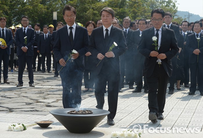 (김해=포커스뉴스) 23일 오후 경남 김해 봉하마을에서 엄수된 故 노무현 전 대통령 서거 7주기 추도식을 마친 뒤 안철수(가운데) 국민의당 상임공동대표, 천정배 공동대표, 박지원 원내대표가 묘역 참배 및 헌화를 하고 있다.