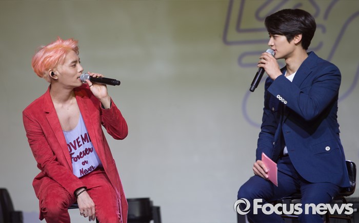 종현의 첫 정규 앨범 '좋아'의 전곡 음원은 오는 24일 0시 각종 음악 사이트를 통해 공개된다. 오는 26일부터는 Mnet '엠카운트다운'을 시작으로 음악방송에도 출연할 예정이다.(서울=포커스뉴스) 23일 오후 서울 강남구 플래툰 쿤스트할레에서 열린 가수 종현의 정규 1집 앨범 '좋아'를 발표 쇼케이스에 참석한 가수 종현(왼쪽)과 민호가 인사를 나누고 있다. 2016.05.23 김유근 기자