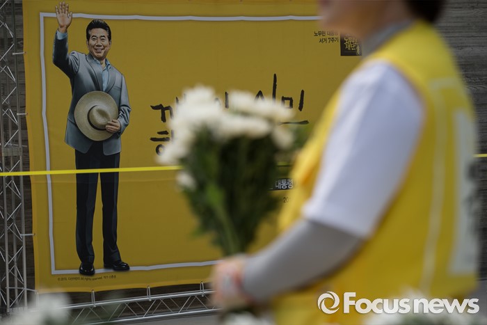(김해=포커스뉴스)故 노무현 전 대통령 서거 7주기인 23일 오후 경남 김해시 진영읍 봉하마을에서 열린 '故 노무현 전 대통령 서거 7주기 추도식'에서 추도식 진행 관계자가 추모객들에게 나눠줄 헌화 다발을 들고 있다.
