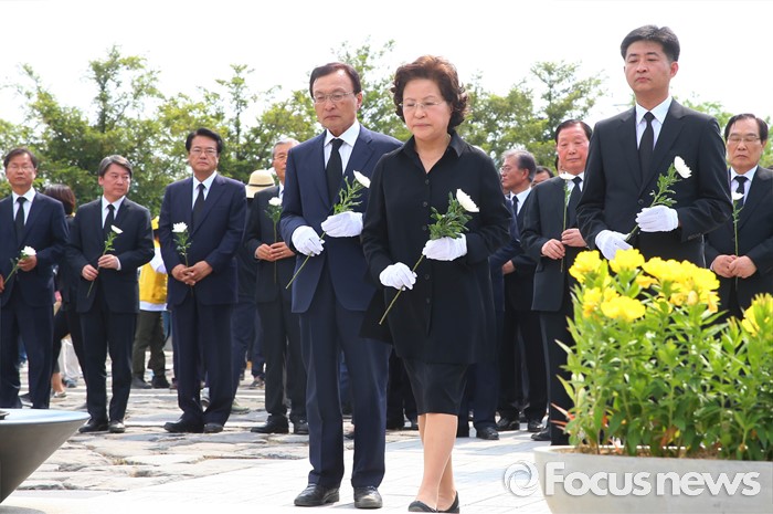 (김해=포커스뉴스) 23일 오후 경남 김해 봉하마을에서 엄수된 故 노무현 전 대통령 서거 7주기 추도식을 마친 뒤 노 전 대통령 부인 권양숙 여사와 장남 건호 씨 등 참석자들이 묘역 참배 및 헌화를 하고 있다.