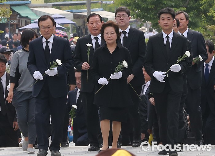 (김해=포커스뉴스) 23일 오후 경남 김해 봉하마을에서 엄수된 故 노무현 전 대통령 서거 7주기 추도식을 마친 뒤 노 전 대통령 부인 권양숙 여사와 장남 건호 씨 등 참석자들이 묘역 참배 및 헌화를 하고 있다.