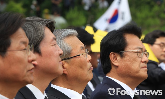 (김해=포커스뉴스) 23일 오후 경남 김해 봉하마을에서 엄수된 故 노무현 전 대통령 서거 7주기 추도식에 참석한 정진석(오른쪽부터) 새누리당 원내대표, 김종인 더불어민주당 비대위 대표, 안철수 국민의당 상임공동대표, 천정배 공동대표가 자리하고 있다.