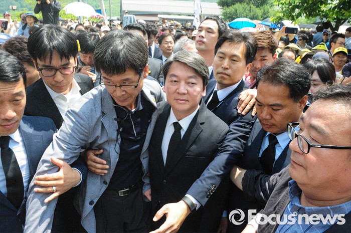 (김해=포커스뉴스) 23일 오후 경남 김해 봉하마을에서 엄수된 故 노무현 전 대통령 서거 7주기 추도식에 안철수 국민의당 상임공동대표가 참석하고 있다.