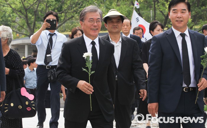 (김해=포커스뉴스) 23일 오후 경남 김해 봉하마을에서 엄수된 故 노무현 전 대통령 서거 7주기 추도식을 마친 뒤 문재인 더불어민주당 전 대표가 묘역 참배 및 헌화를 하고 있다.