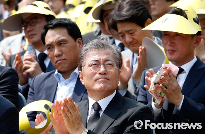 (김해=포커스뉴스) 23일 오후 경남 김해 봉하마을에서 엄수된 故 노무현 전 대통령 서거 7주기 추도식에 참석한 문재인 더불어민주당 전 대표가 박수치고 있다.