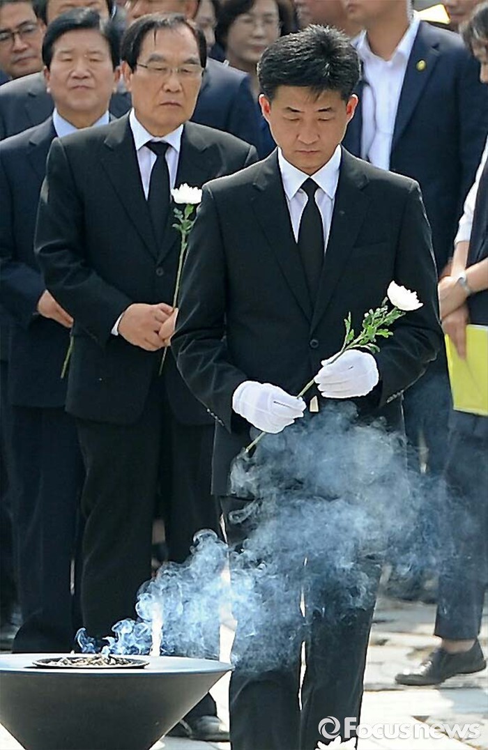 (김해=포커스뉴스) 23일 오후 경남 김해 봉하마을에서 엄수된 故 노무현 전 대통령 서거 7주기 추도식을 마친 뒤 노 전 대통령의 장남 건호 씨가 헌화를 하고 있다.