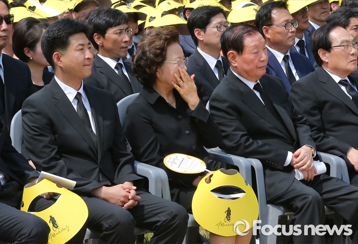 (김해=포커스뉴스) 23일 오후 경남 김해 봉하마을에서 엄수된 故 노무현 전 대통령 서거 7주기 추도식에 참석한 노 전 대통령 부인 권양숙(왼쪽 두번째) 여사가 눈물을 흘리고 있다.