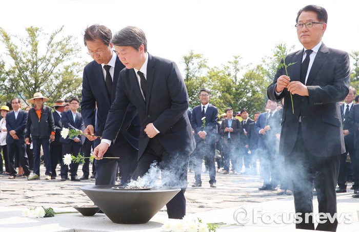 (김해=포커스뉴스) 23일 오후 경남 김해 봉하마을에서 엄수된 故 노무현 전 대통령 서거 7주기 추도식을 마친 뒤 안철수(가운데) 국민의당 상임공동대표, 천정배(왼쪽) 공동대표, 박지원 원내대표가 묘역 참배 및 헌화를 하고 있다.