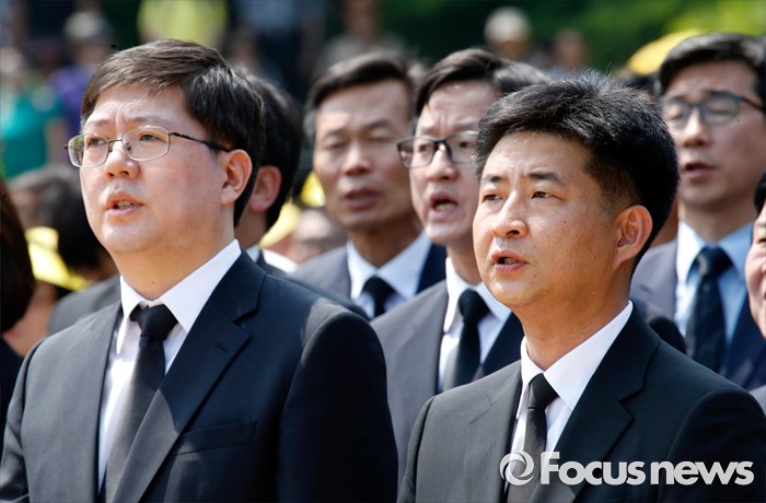 (김해=포커스뉴스) 23일 오후 경남 김해 봉하마을에서 엄수된 故 노무현 전 대통령 서거 7주기 추도식에 참석한 노 전 대통령의 장남 건호(오른쪽) 씨와 김홍걸 더불어민주당 국민통합위원장이 임을 위한 행진곡을 부르고 있다.