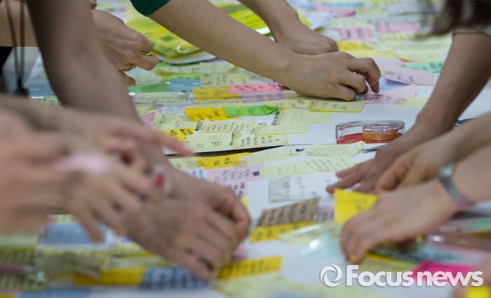 (서울=포커스뉴스) 23일 오후 서울 동작구 서울여성플라자 로비에 마련된 추모 전시장에서 여성가족재단 직원들이 강남역 묻지마 살인 피해자 추모 기록물들을 정리하고 있다.