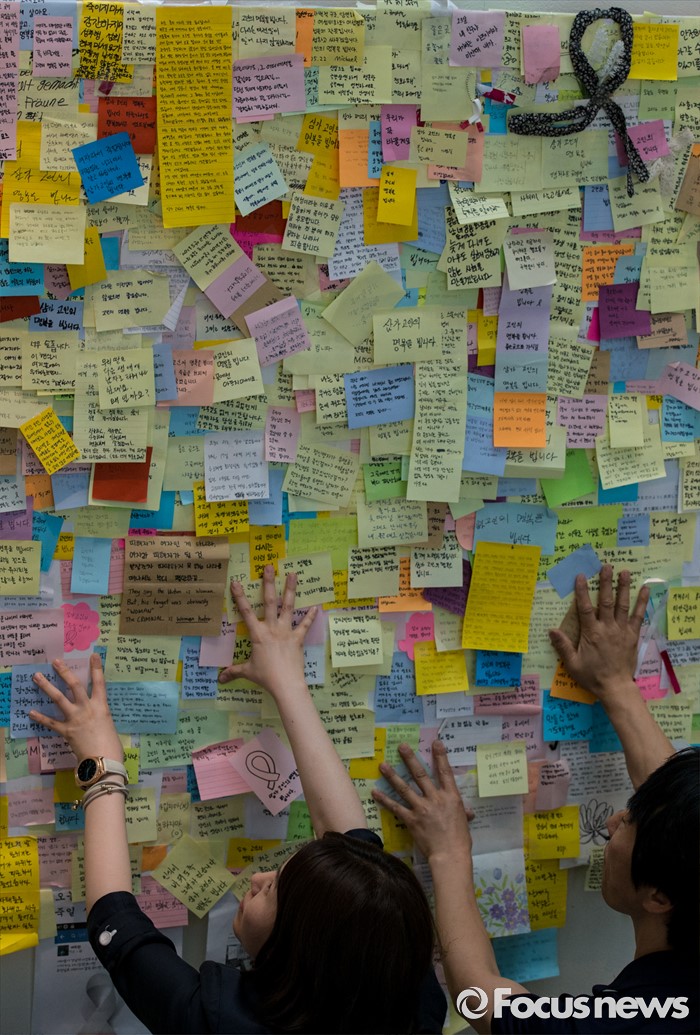 (서울=포커스뉴스) 23일 오후 서울 동작구 서울여성플라자 로비에 마련된 추모 전시장에서 여성가족재단 직원들이 강남역 묻지마 살인 피해자 추모 기록물들을 게시하고 있다.