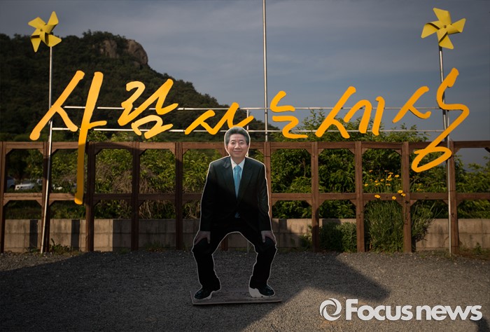 (김해=포커스뉴스)故 노무현 전 대통령 서거 7주기인 23일 오후 경남 김해시 진영읍 봉하마을 '추모의 집' 앞에 '사람 사는 세상' 이란 글귀와 함께 노무현 전 대통령의 사진이 놓여져 있다.