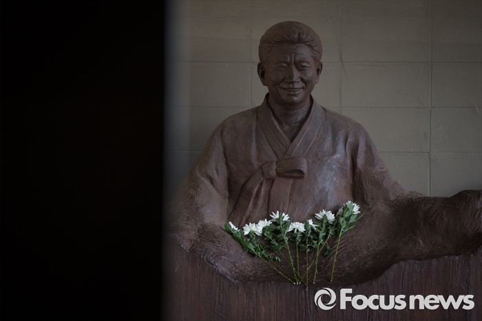 (김해=포커스뉴스)故 노무현 전 대통령 서거 7주기인 23일 오후 경남 김해시 진영읍 봉하마을 '추모의 집' 앞에 놓인 노무현 전 대통령 동상 앞에 추모객들이 헌화한 꽃들이 놓여져 있다.