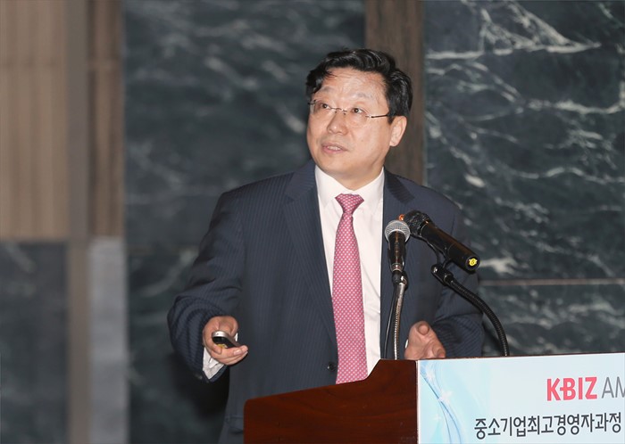 | △ 중소기업 최고경영자 과정 입학식 참석, 강연하는 주형환 장관 |