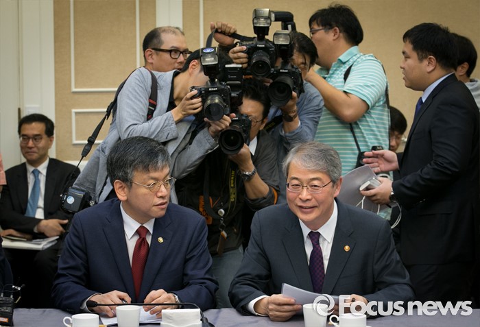 (서울=포커스뉴스) 24일 오전 서울 여의도 국회 귀빈식당에서 열린 조선·해운업 구조조정 관련 당정협의에 참석한 임종룡(오른쪽) 금융위원장과 최상목 기획재정부 1차관이 대화하고 있다.