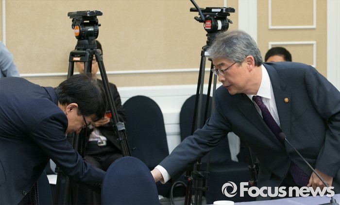 (서울=포커스뉴스) 24일 오전 서울 여의도 국회 귀빈식당에서 열린 조선·해운업 구조조정 관련 당정협의에 참석한 임종룡(오른쪽) 금융위원장과 고영선 고용노동부 차관이 인사하고 있다.