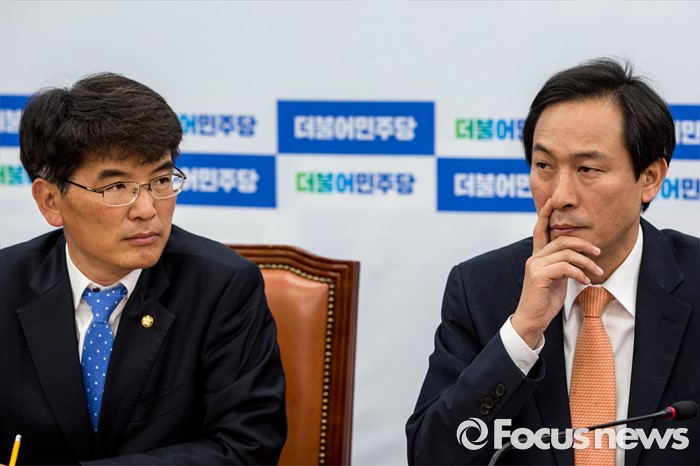 (서울=포커스뉴스) 우상호(오른쪽) 더불어민주당 원내대표와 박완주 더불어민주당 원내수석부대표가 24일 오전 서울 여의도 국회의서 열린 원내대책회의에 참석 하고 있다.