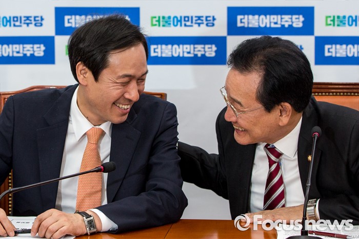 (서울=포커스뉴스) 우상호(왼쪽) 더불어민주당 원내대표와 변재일 더불어민주당 정책위의장이 24일 오전 서울 여의도 국회의서 열린 원내대책회의에 참석해 대화를 나누고 있다.
