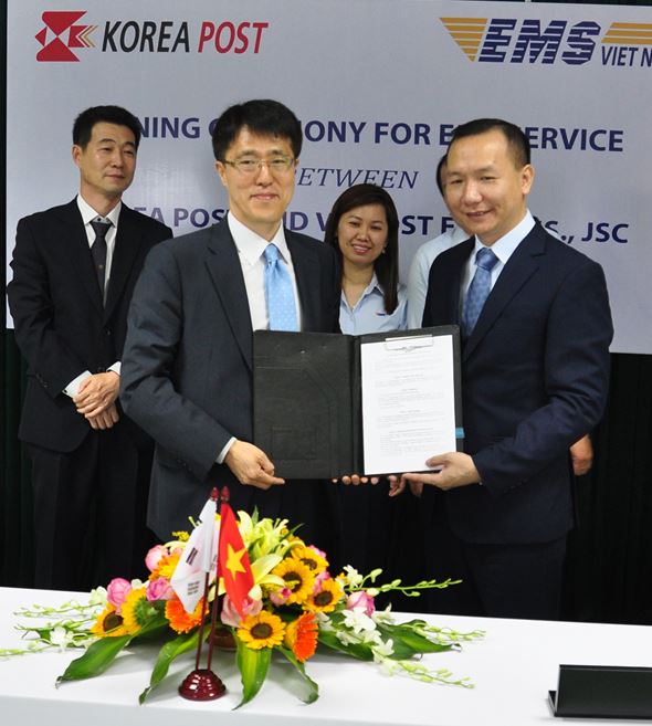 박종석 우정사업본부 우편사업단장은 "이번에 도입하는 신규서비스는 한국우정에서 처음으로 시행하는 서비스"라면서, "앞으로 서비스 대상 국가를 확대해 우리나라 기업들의 수출이 더욱 활성화 되도록 노력하겠다"고 말했다.우정사업본부 박종석 우편사업단장(왼쪽)과 레 꾸옥 안 베트남우정특급회사 사장이 23일(한국시간) 베트남 다낭에서 한-베트남 국제특송 서비스 확대를 위한 양해각서를 체결하고 있다. <사진제공=우정사업본부>