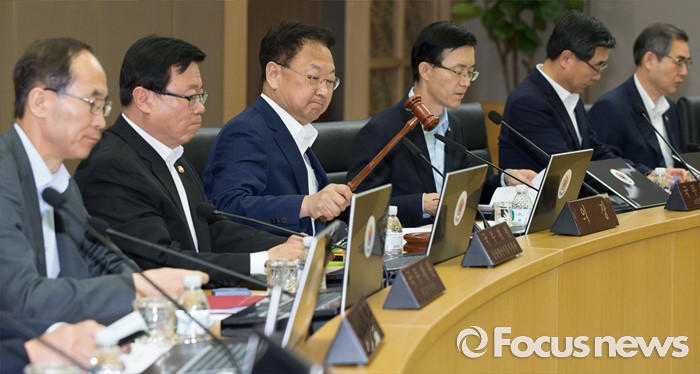 (세종=포커스뉴스) 유일호(왼쪽 세 번째) 경제부총리 겸 기획재정부장관이 24일 오전 세종시 정부세종청사 국무회의장에서 서울-세종 영상회의로 열린 국무회의에 참석해 회의시작을 알리는 의사봉을 두드리고 있다.