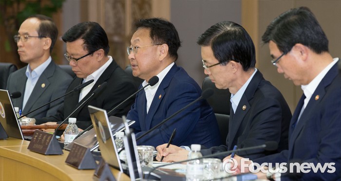 (세종=포커스뉴스) 유일호(왼쪽 세 번째) 경제부총리 겸 기획재정부장관이 24일 오전 세종시 정부세종청사 국무회의장에서 서울-세종 영상회의로 열린 국무회의를 주재하고 있다.