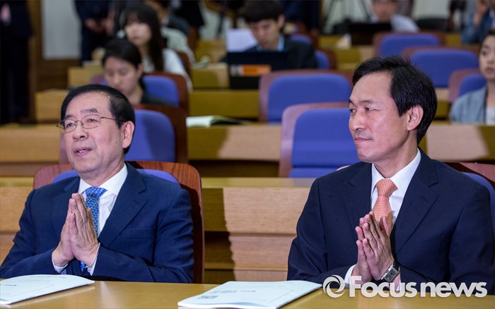(서울=포커스뉴스) 우상호(오른쪽) 더불어민주당 원내대표와 박원순 서울시장이 24일 오전 서울 여의도 국회의원회관에서 열린 '지자체장 초청 일자리 정책 콘서트'에 참석해 박수 치고 있다.