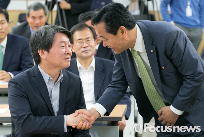(서울=포커스뉴스) 24일 오전 서울 여의도 국회 의원회관에서 열린 국민의당 6차 정책역량강화 워크숍에 참석한 안철수(왼쪽) 상임공동대표와 김관영 원내수석부대표가 인사하고 있다.