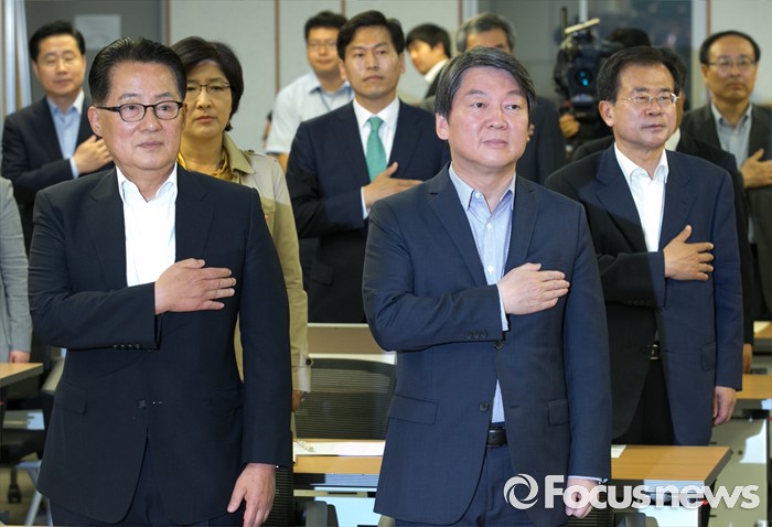 (서울=포커스뉴스) 24일 오전 서울 여의도 국회 의원회관에서 열린 국민의당 6차 정책역량강화 워크숍에 참석한 안철수(오른쪽) 상임공동대표와 박지원 원내대표 등 참석자들이 국기에 대한 경례를 하고 있다.