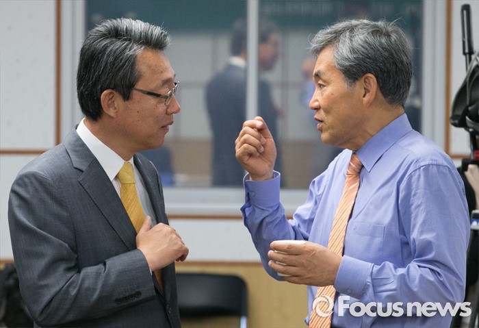 (서울=포커스뉴스) 24일 오전 서울 여의도 국회 의원회관에서 열린 국민의당 6차 정책역량강화 워크숍에 참석한 김성식(왼쪽) 정책위의장과 이상돈 최고위원이 대화하고 있다.
