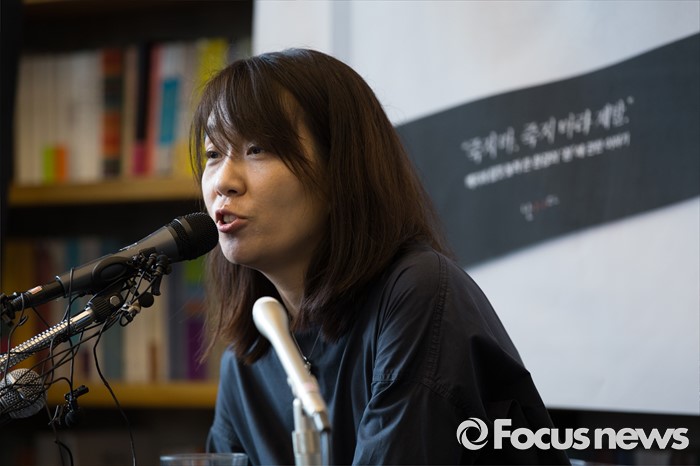 (서울=포커스뉴스) 소설' 채식주의자'로 세계 3대 문학상인 맨부커상을 수상한 한강이 24일 오전 서울 마포구 카페 꼼마에서 열린 신작소설 '흰' 출간 기자간담회에서 취재진의 질문에 답하고 있다.