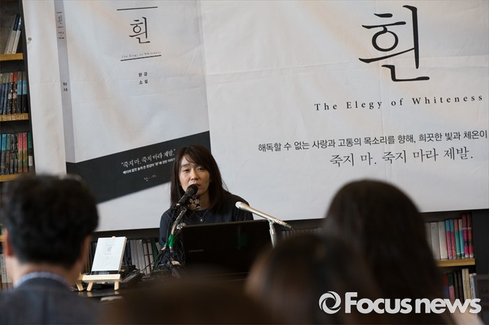 (서울=포커스뉴스) 소설' 채식주의자'로 세계 3대 문학상인 맨부커상을 수상한 한강이 24일 오전 서울 마포구 카페 꼼마에서 열린 신작소설 '흰' 출간 기자간담회에서 취재진의 질문에 답하고 있다.