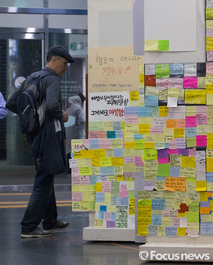 | △ 강남역 살인사건 추모쪽지 바라보는 외국인 |