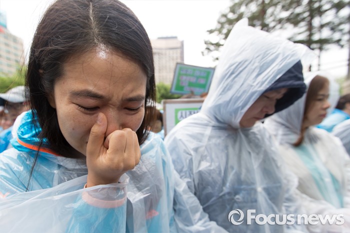 (서울=포커스뉴스) 24일 오전 서울 중구 서울시청 앞에서 열린 '서울시 발달장애인 부모 무기한 삭발결의 선포 기자회견'에 참석한 전국장애인부모연대 회원이 눈물을 흘리고 있다.