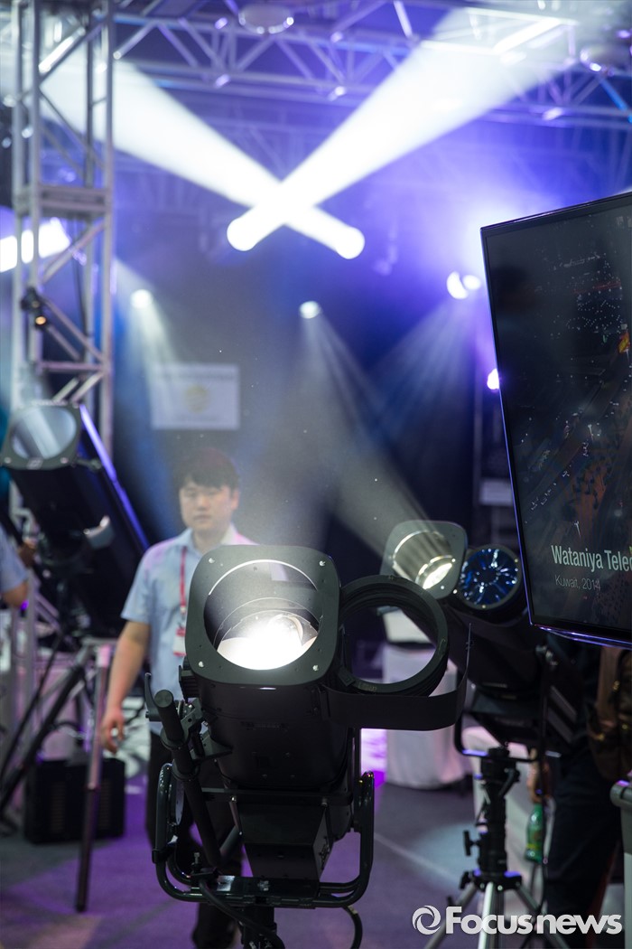 (서울=포커스뉴스) 24일 오전 서울 강남구 코엑스에서 열린 '제26회 국제 방송·음향·조명기기 전시회'의 한 부스 관계자가 조명사이를 지나고 있다.