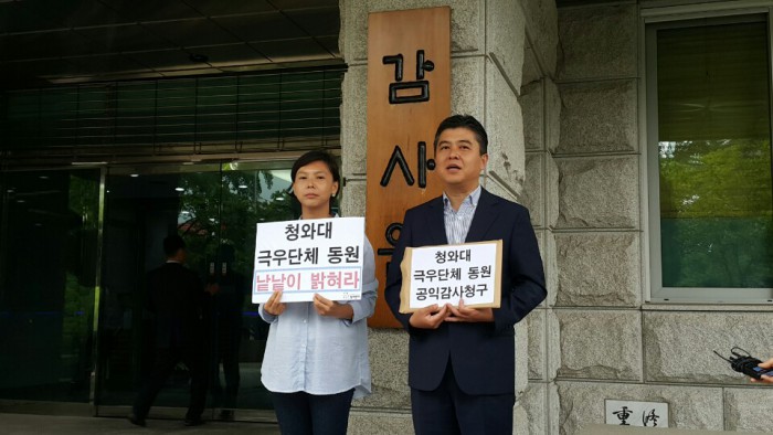 참여연대 행정감시센터는 24일 오전 서울 종로구 감사원 앞에서 기자회견을 열고 "청와대가 조직적으로 보수단체의 집회·시위를 지시했을 가능성이 높다"며 "허현준 행정관 외 5명을 직권남용 및 직무유기 혐의로 감사청구한다"고 밝혔다.
