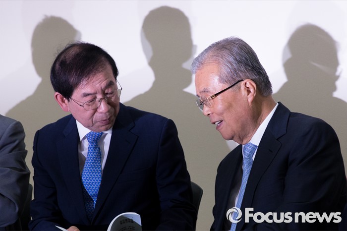(서울=포커스뉴스) 김종인(오른쪽 더불어민주당 비상대책위 대표와 박원순 서울시장이 24일 오전 서울 여의도 국회의원회관에서 열린 '더불어민주당, 지자체장 초청 일자리 정책 콘서트'에 참석해 대화를 나누고 있다.