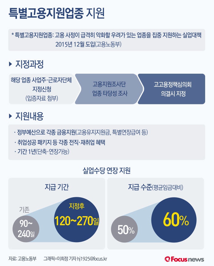 (서울=포커스뉴스) '특별고용지원업종'은 노동부가 지난해 12월말 도입한 제도로, 고용 사정이 급격히 악화될 우려가 있는 업종에 각종 지원을 해주는 제도다. '특별고용지원업종'으로 지정되면 사업주와 실업자는 고용유지지원금과 특별연장급여 등 각종 금융지원을 받을 수 있게 된다.