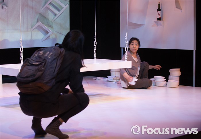(서울=포커스뉴스) 24일 오후 서울 종로구 CJ아지트 대학로점에서 열린 연극 '크레센도 궁전' 프레스콜에 참여한 배우 김소진(왼쪽)과 강애심이 주요장면을 시연하고 있다.