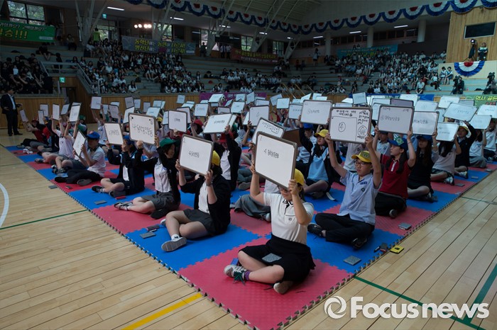 (서울=포커스뉴스) 24일 오후 서울 강북구 신일중학교 체육관에서 열린 근현대사기념관 개관 기념 '역사 골든벨'에 참석한 학생들이 본선 골든벨 퀴즈를 풀고 있다.