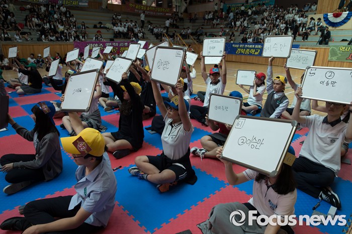 (서울=포커스뉴스) 24일 오후 서울 강북구 신일중학교 체육관에서 열린 근현대사기념관 개관 기념 '역사 골든벨'에 참석한 학생들이 본선 골든벨 퀴즈를 풀고 있다.