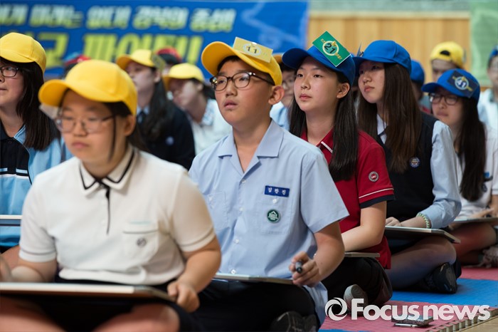 (서울=포커스뉴스) 24일 오후 서울 강북구 신일중학교 체육관에서 열린 근현대사기념관 개관 기념 '역사 골든벨'에 참석한 학생들이 본선 골든벨 퀴즈를 풀고 있다.