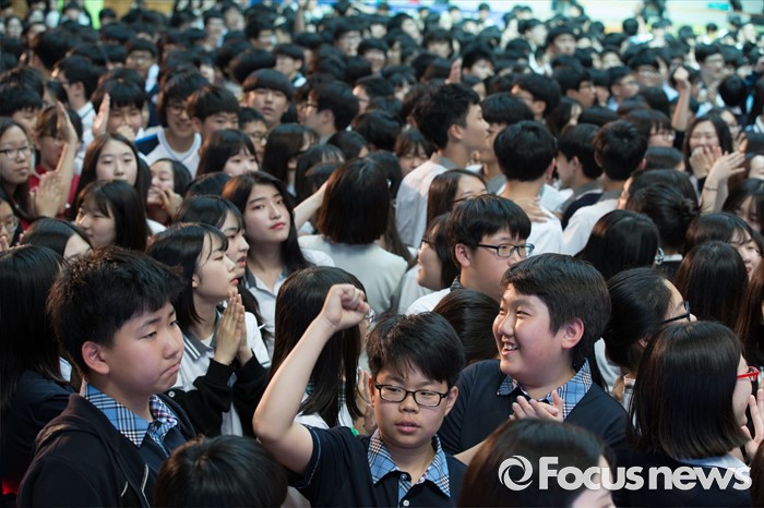 (서울=포커스뉴스) 24일 오후 서울 강북구 신일중학교 체육관에서 열린 근현대사기념관 개관 기념 '역사 골든벨'에 참석한 학생들이 예선전 O.X 퀴즈를 풀고 있다.
