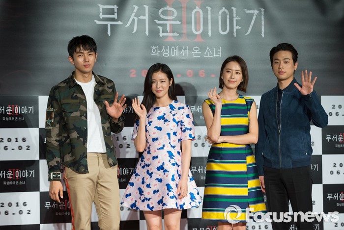 '무서운 이야기3'은 호러에 새로운 소스를 덧입혀 탄생했다. 이는 스페인 카탈로니아 지방에서 열리는 '제49회 시체스영화제'에 경쟁부문으로 초청되기도 했다. 국내에서는 오는 6월 1일 개봉해 관객과 만날 예정이다.'여우골'을 연출한 백승빈 감독, '로드레이지'를 연출한 김선 감독, '기계령'을 연출한 김곡 감독(위쪽부터)의 촬영현장 모습. <사진제공=롯데엔터테인먼트>(서울=포커스뉴스) 11일 오전 서울 광진구 롯데시네마 건대입구점에서 열린 영화 '무서운이야기3' 제작보고회에 참석한 배우 임슬옹(왼쪽부터), 경수진, 홍은희, 박정민이 포토타임을 갖고 있다. 2016.05.11 김유근 기자