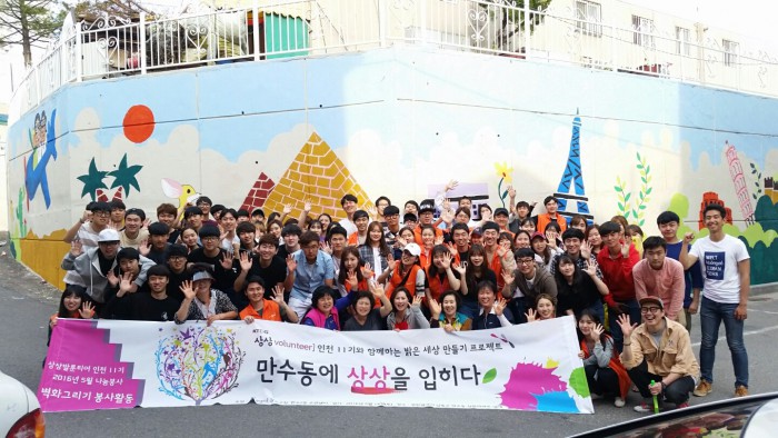 한편, '상상을 입히다' 프로젝트는 KT&G 대학생 봉사단인 '상상발룬티어'가 기획했다. '상상발룬티어'는 지난 2011년 결성돼 현재까지 1200여회에 달하는 봉사활동을 펼쳤으며, 소속인원은 6500여명에 이른다.KT&G 대학생 봉사단 '상상발룬티어'가 지난 14일 인천 만수동에서 벽화 그리기 작업을 완료하고 기념촬영하고 있다.<사진제공=KT&G>